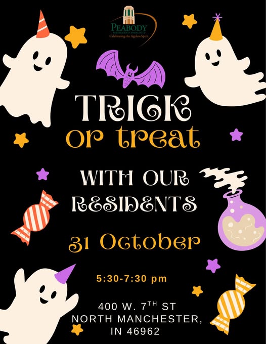 To help make the event extra sweet, we’re collecting candy donations for our residents to hand out during the Trick-or-Treat. Donations can be dropped off at the Peabody front desk (400 W 7th St, North Manchester) on Wednesday, October 30, between 8:00 a.m. and 6:00 p.m. 🍬